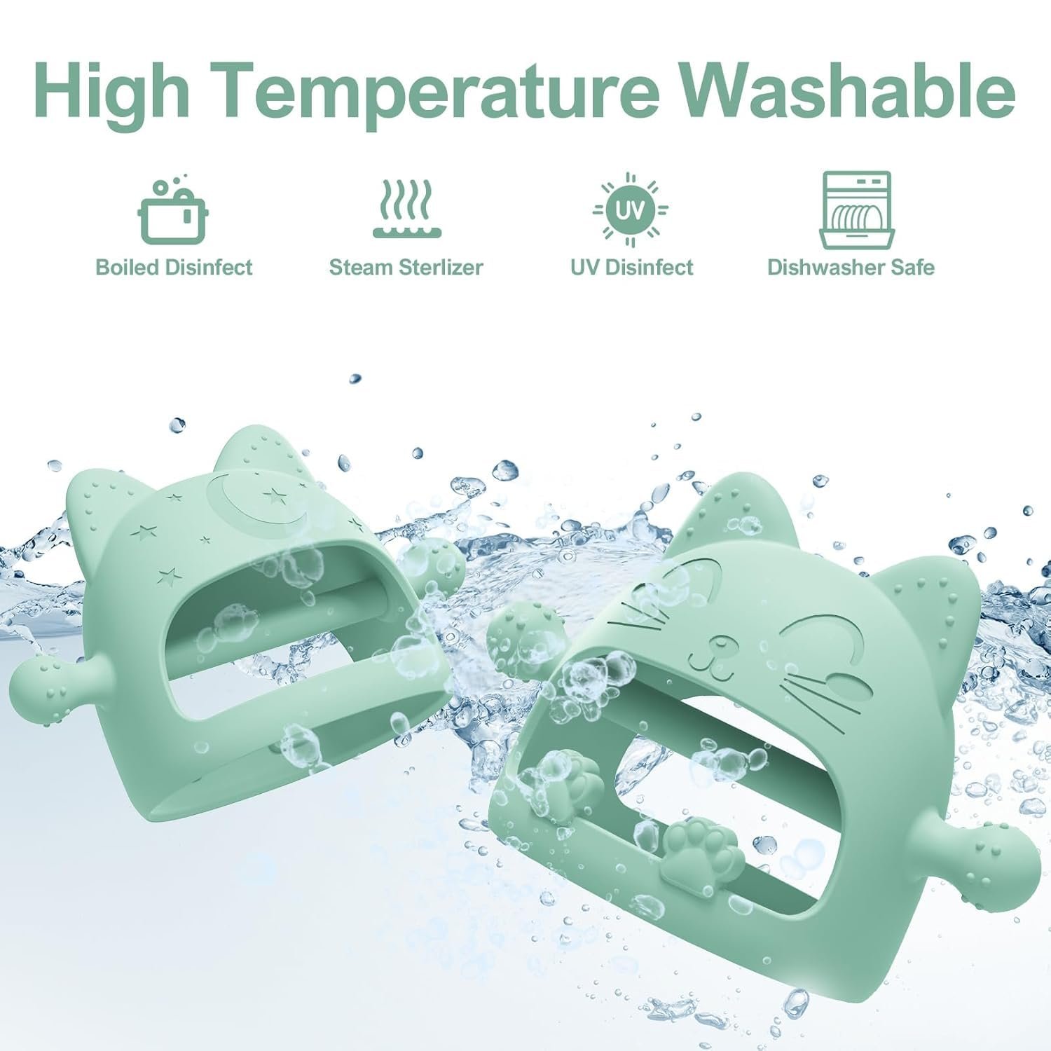 【Teething Toys For Babies 0-6 Months】Our cartoon cat baby teether is specially designed for newborns, the teether toys imitates a nipple shape on both sides,which may help babies transition from breastfeeding or bottle feeding to chewing on a teething toy,and soft silicone touch points on the top are designed to accommodate baby’s bite in different directions. This design element can provide a familiar feel for babies and make them more comfortable with the teether